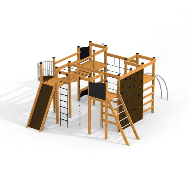 This climbing booth is crafted from durable larch wood combined with stainless steel and galvanised steel elements, ensuring long-lasting stability and resistance to weather conditions. The use of recycled HDPE and reinforced PP ropes adds eco-friendly and robust features, while soft PP ropes and anti-slip waterproof plywood enhance user comfort and safety. Additional components made from PP and PE contribute to the structure’s overall resilience and maintenance ease.
